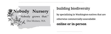 A small grower of Washington native plants on the land of the spuyaləpabš (Puyallup) people in Des Moines, WA, building biodiversity by specializing in species that are otherwise commercially unavailable. For gardens and restoration. Consultation, delivery, invasive weed removal, irrigation, design, and installation available.